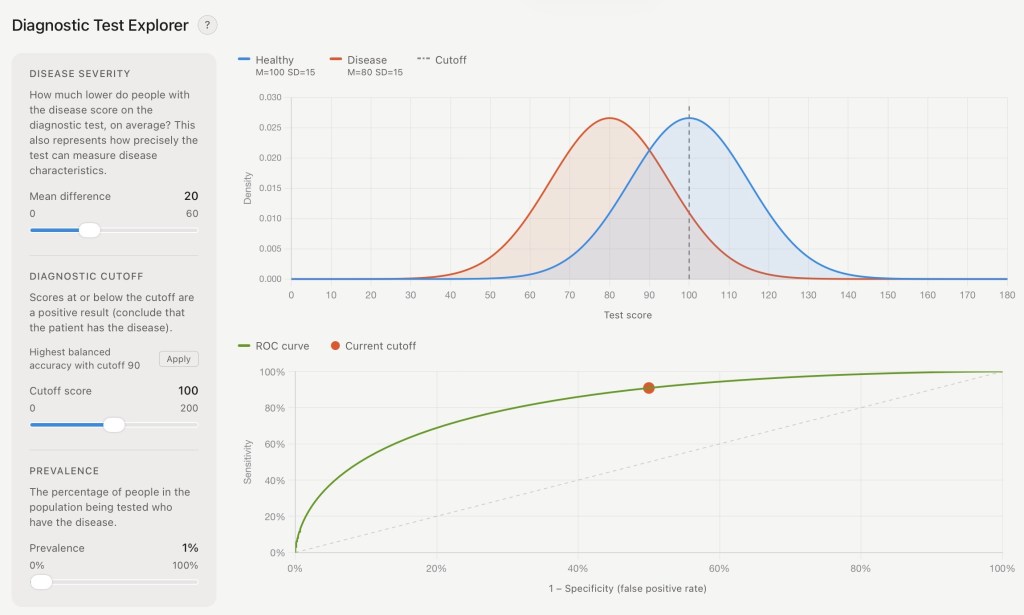 That’s complicated, so I built a tool to explore how diagnostic testing accuracy works, without having to get any diseases. Try it out here: Diagnostic Test Explorer.